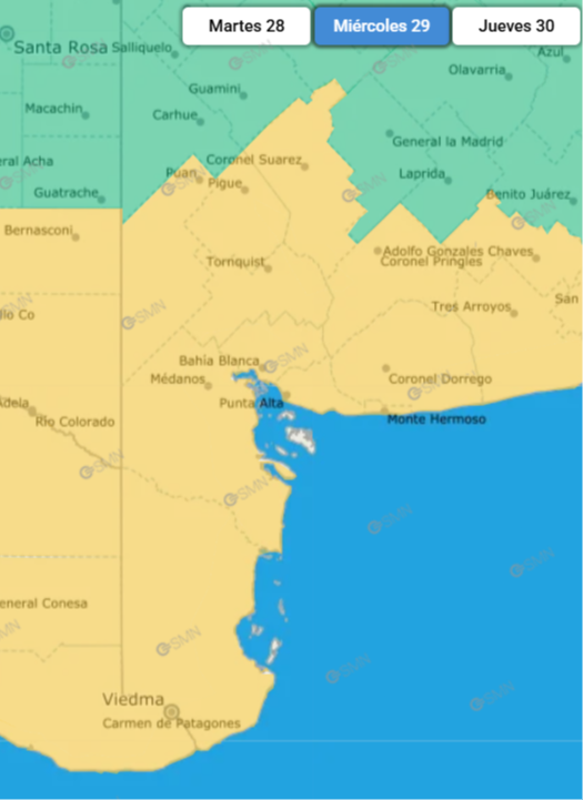 Además de Bahía Blanca, están comprendidos en el alerta los distritos de Patagones, Villarino, Puan, Saavedra, Coronel Suárez, Tornquist, Monte Hermoso, Coronel Rosales, Coronel Pringles y Coronel Dorrego. También se incluye el sur pampeano y toda la provincia de Río Negro.