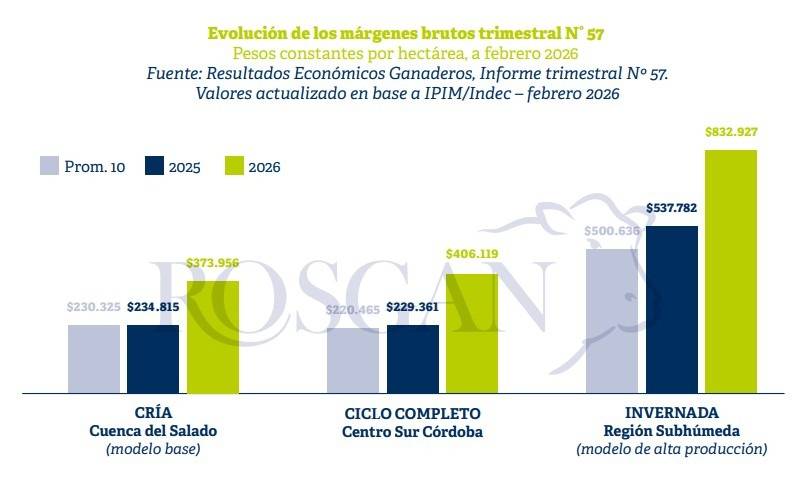Por su parte, en sistemas de invernada, aun considerando el costo de reposición que exige actualmente el ternero, los márgenes continúan siendo elevados. “En un modelo de alta producción, con una carga de 2,8 cabezas por hectárea y una producción de 216 kilos por cabeza en menos de 12 meses, el margen bruto se ubica en torno a los 833.000 pesos por hectárea”, indica.