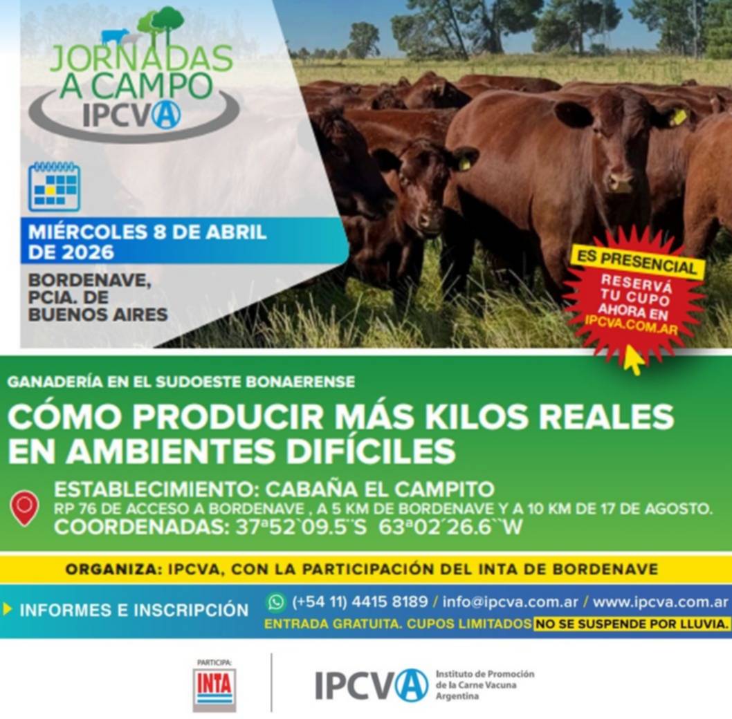 Como es habitual, el acceso es libre y gratuito, aunque con cupos limitados y por eso se requiere inscripción previa. En tal sentido, el registro puede realizarse en este link: jornada a campo del IPCVA en Bordenave.