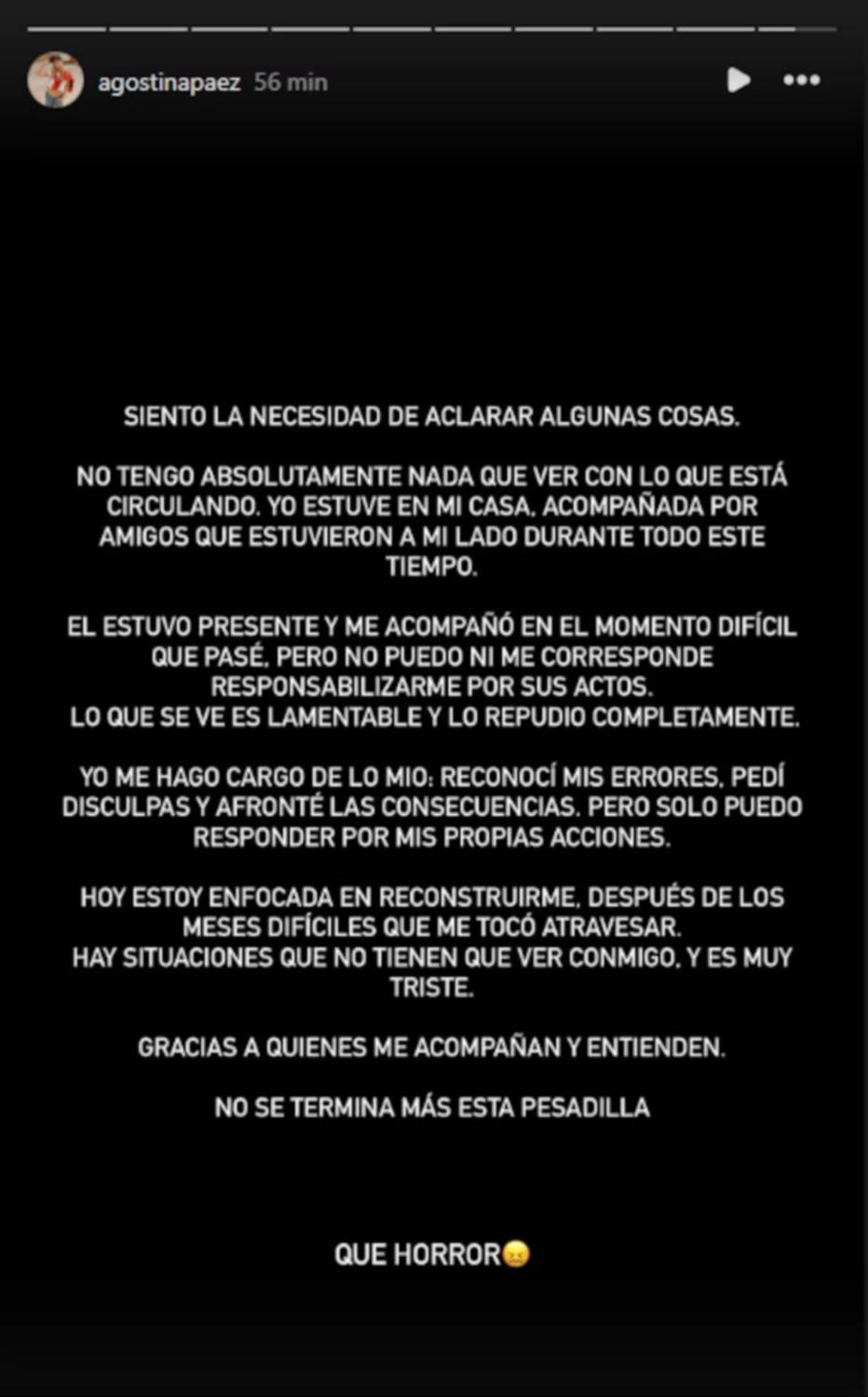 En su mensaje, la joven también hizo una autocrítica sobre su propia situación judicial. “Yo me hago cargo de lo mío: reconocí mis errores, pedí disculpas y afronté las consecuencias. Pero solo puedo responder por mis propias acciones”, sostuvo.