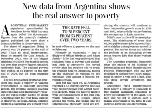 La publicación resaltó que la tasa de pobreza descendió al 28% al cierre de 2025, tras haber tocado un pico del 53% a mediados del año anterior.
