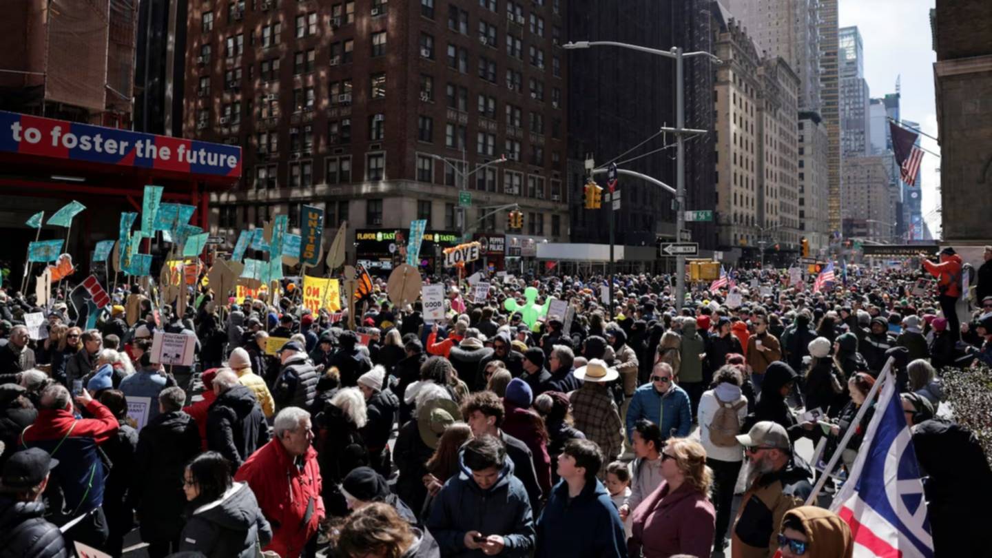 Los manifestantes denunciaron la “guerra ilegal” que Trump comenzó hace un mes en Irán, lo que ha implicado una subida de los combustibles e inflación, además de reafirmar sus críticas contra los “abusos” del Servicio de Inmigración y Aduanas (ICE).