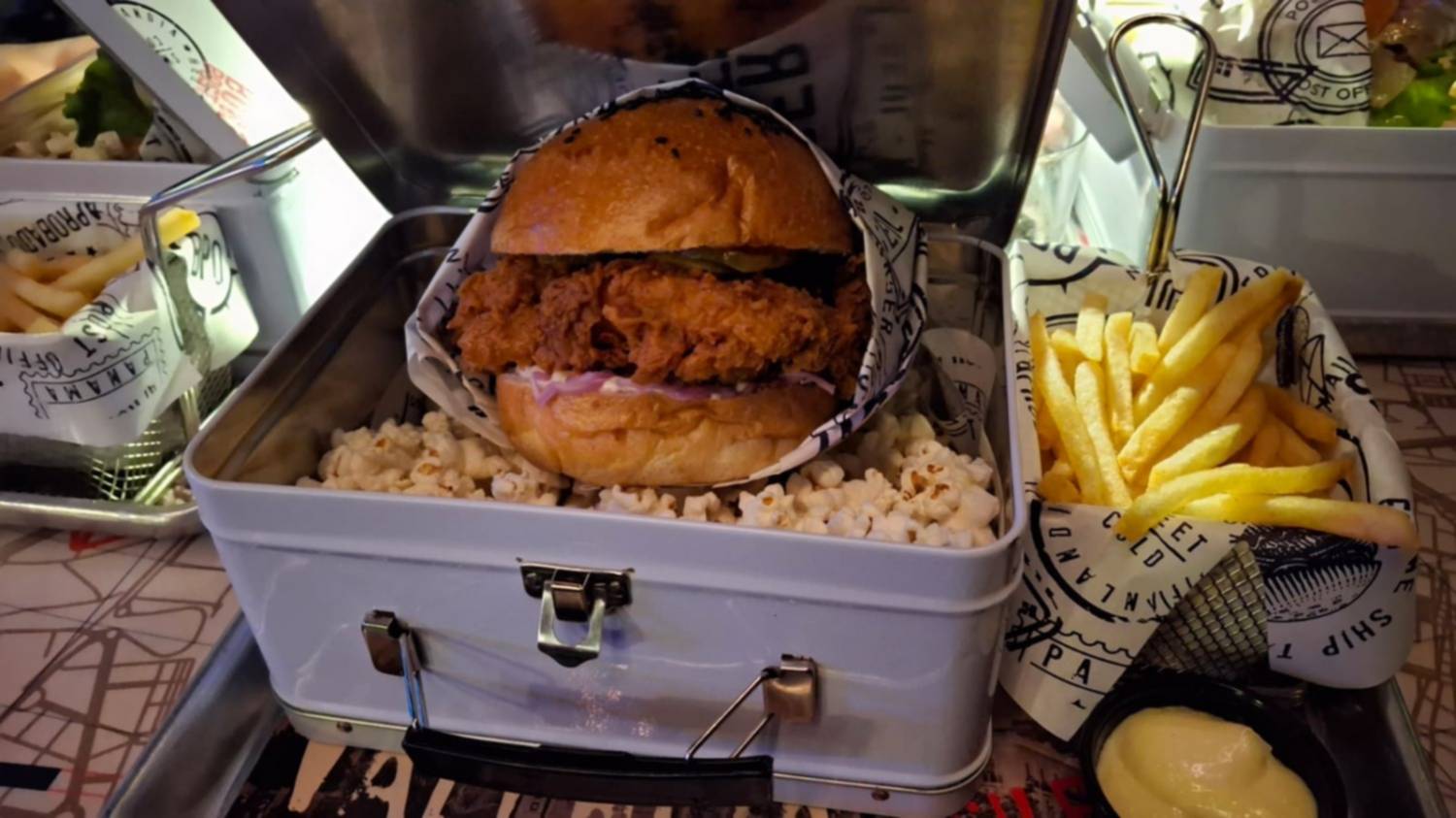 Tiene un piso vidriado para caminar (no me animé hasta que me insistieron para una foto...), una tirolesa y una súper hamaca en la que, cuando vas para adelante, quedás literalmente en el aire y a la que, para poder continuar con esta cobertura, no me subí. Sí, preferí recuperar energías con una hamburguesa que venía en un cofre y flotando en palomitas de maíz...