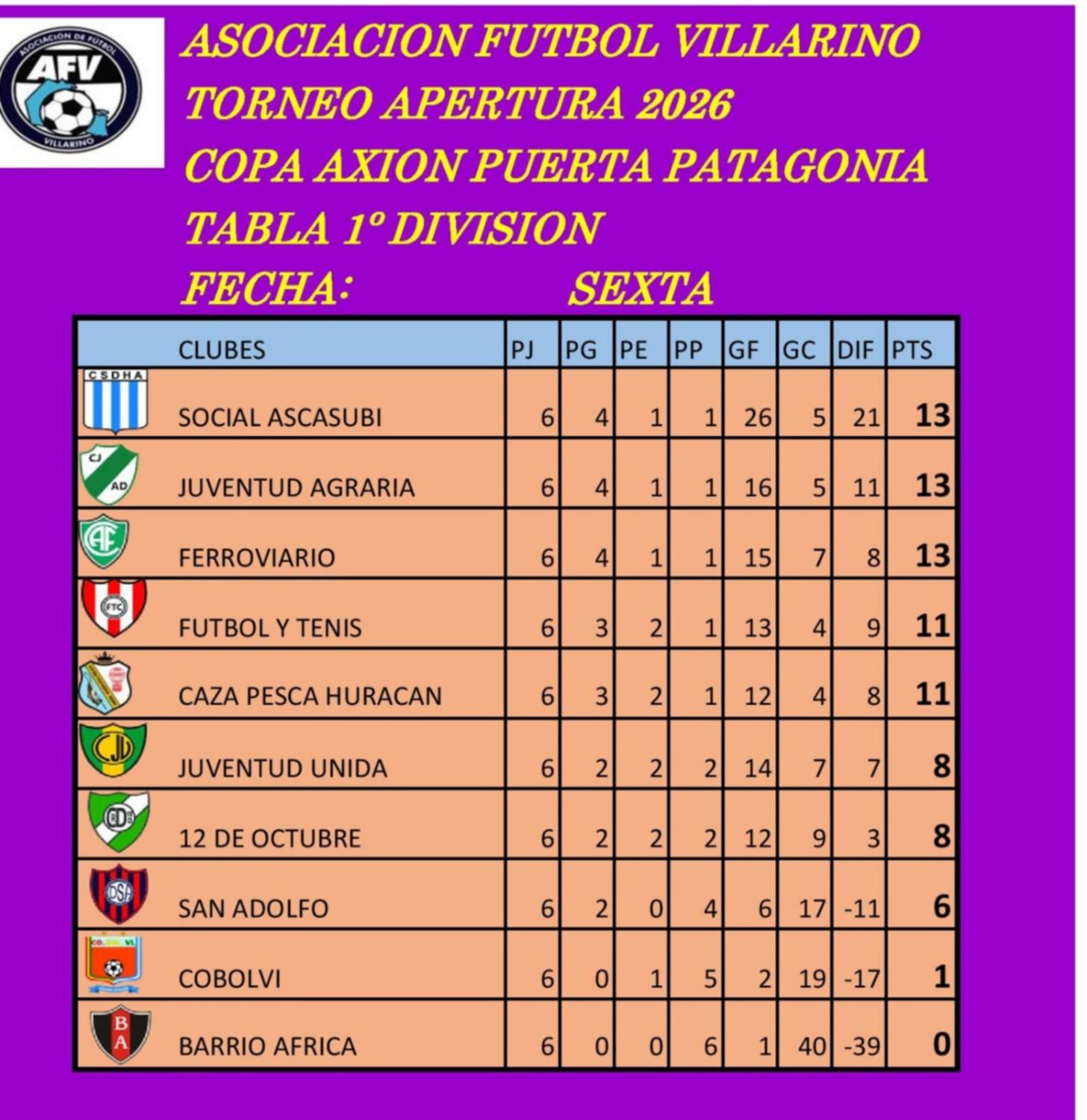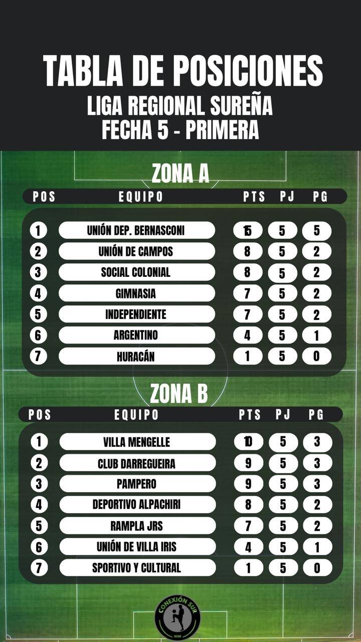 -Así están las posiciones en la "A": 1°) Huracán, 13 puntos; 2°) Libertad, 12; 3º) Villa Mitre, 9; 4°) Bella Vista y Liniers, 7; 6°) Sporting y La Armonía, 6; 8°) San Francisco 3.