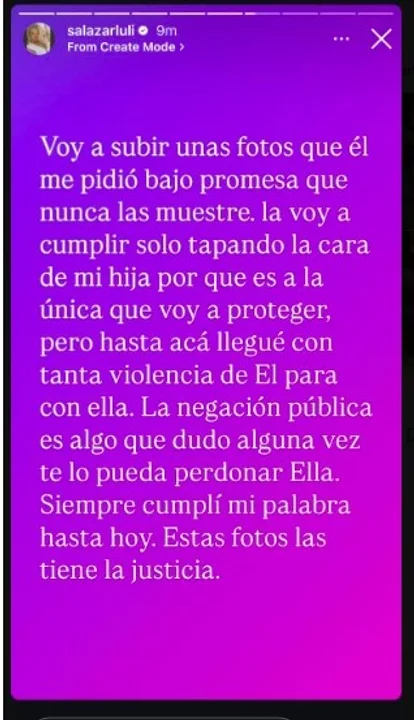 “Voy a subir fotos que él me pidió bajo promesa que nunca las muestre. Hasta acá llegué con tanta violencia de él para con ella. La negación pública es algo que dudo que mi hija llegue a perdonar alguna vez. Siempre cumplí mi palabra hasta hoy. Estas fotos las tiene la Justicia”, aseguró Luciana Salazar.